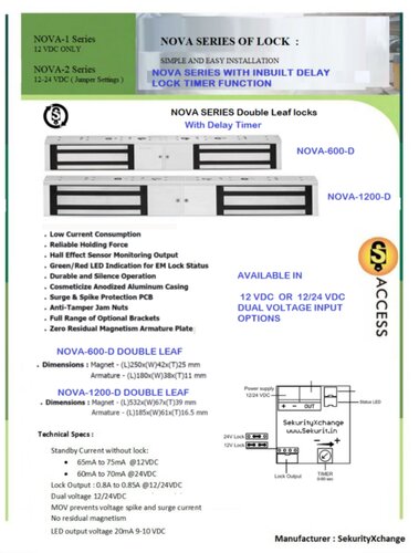 | Features | DOUBLE LEAF EM LOCK WITH TIMER |