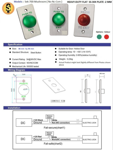 GREEN-Medium Sek-700-Mushroom -SPDT-Green 3 pins Push Button. SS Heavy Duty Flat Body Exit Button