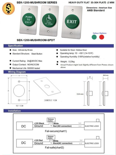 | Features | MUSHROOM HEAD MOMENTARY DOOR EXIT PUSH BUTTON IN HEAVY DUTY SS FLAT PLATE |