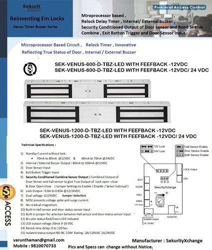 SEKURIT 600 LBS DOUBLE LEAF LOCK WITH TIMER & BUZZER FUNCTIONS . VENUS-600-D-TBZ-LED-TIMER, BUZZER & FEEDBACK 12 VDC . DUAL SENSOR INPUT FOR HALL SENSOR AND REED SENSOR ( OPTIONAL ) .